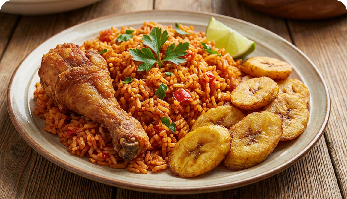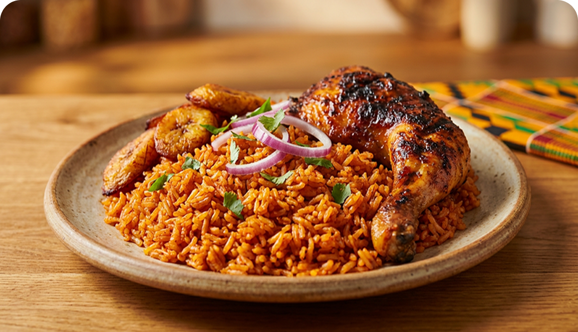 Our signature jollof rice, cooked to perfection, served with succulent fried chicken.