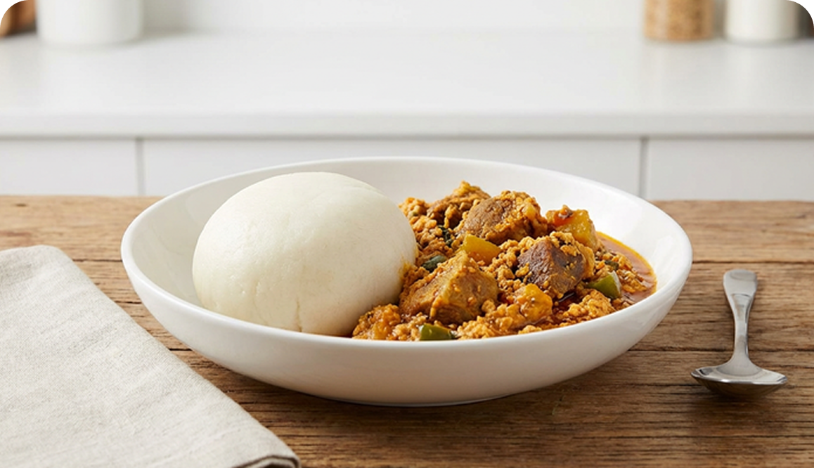 Rich and savory Egusi with assorted meats, meats paired with freshly pounded yam.